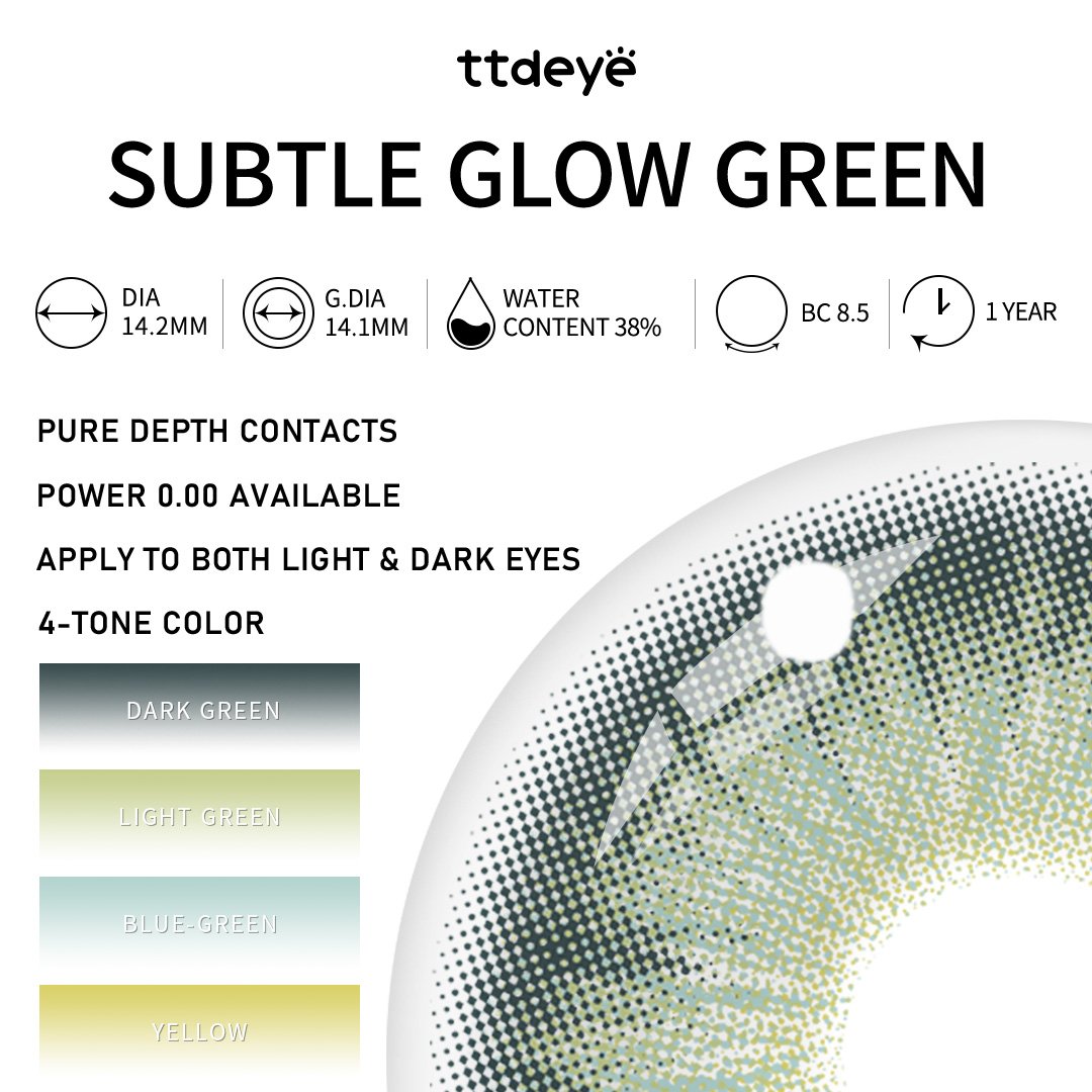 Inspirado en el misterio sereno de los bosques profundos, Subtle Glow Green combina un verde bosque intenso con oliva y toques de lima para una mirada luminosa y con profundidad. El patrón radial irregular se extiende hacia el centro, imitando la textura natural del iris, mientras que el anillo exterior oscuro agranda sutilmente los ojos para mayor profundidad y definición. Un brillo interior más claro recrea el efecto de la luz del sol filtrándose entre las hojas, brindando una mirada refinada y enigmática que se siente natural y a la vez impactante.