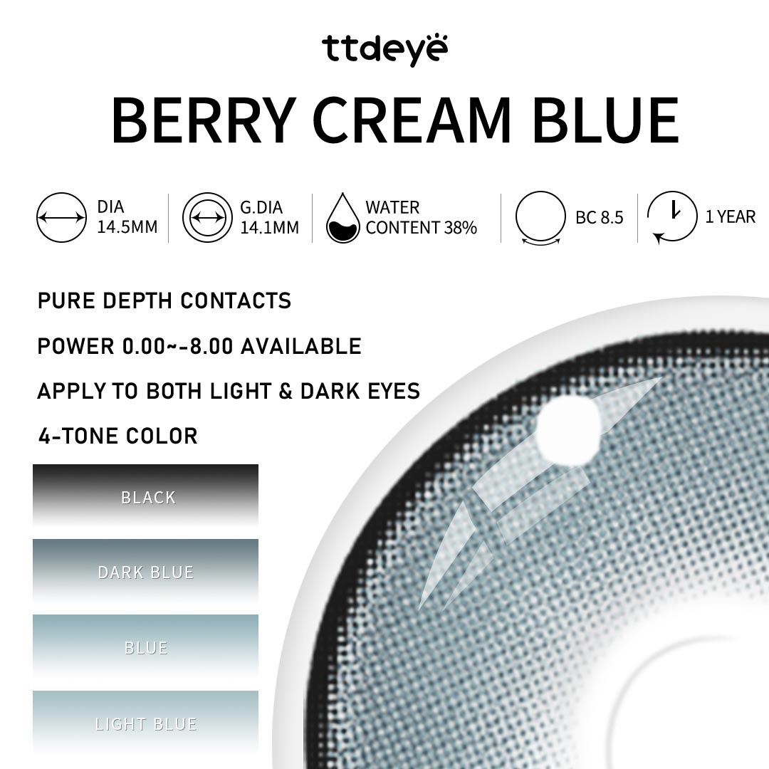 Descubre un toque de misterio con las lentillas Berry Cream Blue. Un anillo exterior negro intenso enmarca un centro azul océano transparente, que le da a tus ojos un brillo fresco y luminoso, como la lágrima de una sirena bajo la luz de la luna. La transición ahumada realza la profundidad, mientras que la delicada mezcla de azul oscuro y claro crea un brillo cristalino con un encanto exótico. Perfectas para añadir elegancia y atractivo a tu look diario o para ocasiones especiales.