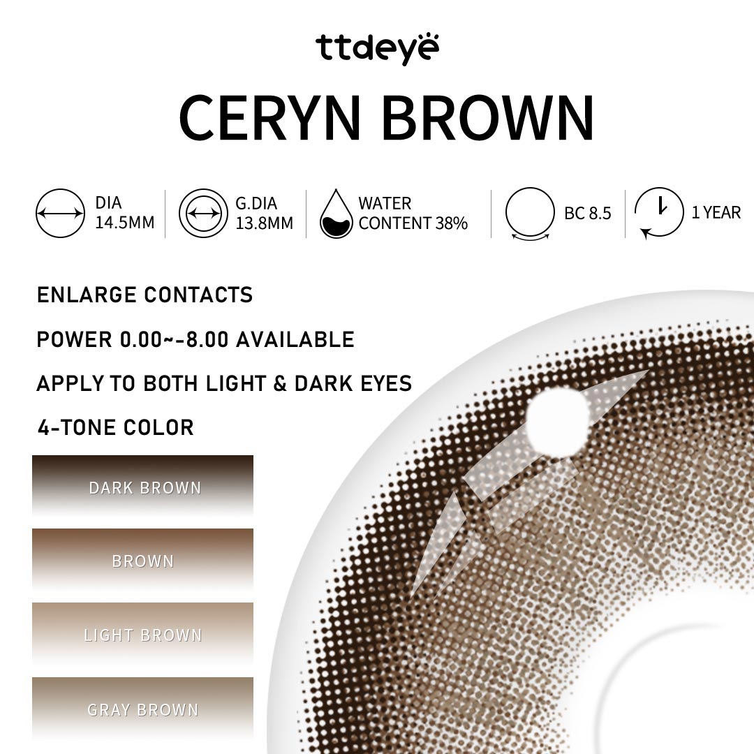 Las lentillas Ceryn Brown capturan una elegancia natural y sutil. Con un anillo exterior marrón oscuro intenso, una base marrón suave y un círculo interior marrón claro, combinados con patrones de iris gris-marrón apagados, estas lentillas aportan una profundidad sutil y un brillo cálido y natural a tus ojos.