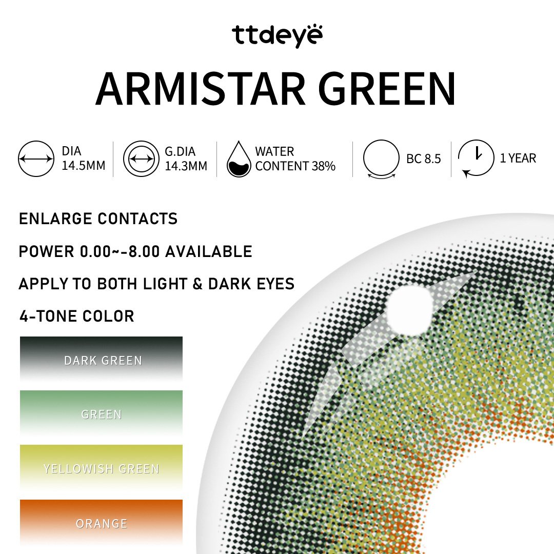 Armistar Green es una lente de contacto verde creada en colaboración con la influencer @Luckysoul, diseñada para brindar un color intenso y un impacto instantáneo. Un anillo limbal verde bosque profundo define los ojos, mientras que los vibrantes tonos verde hierba y lima brillante dan vida al iris con una claridad impactante.