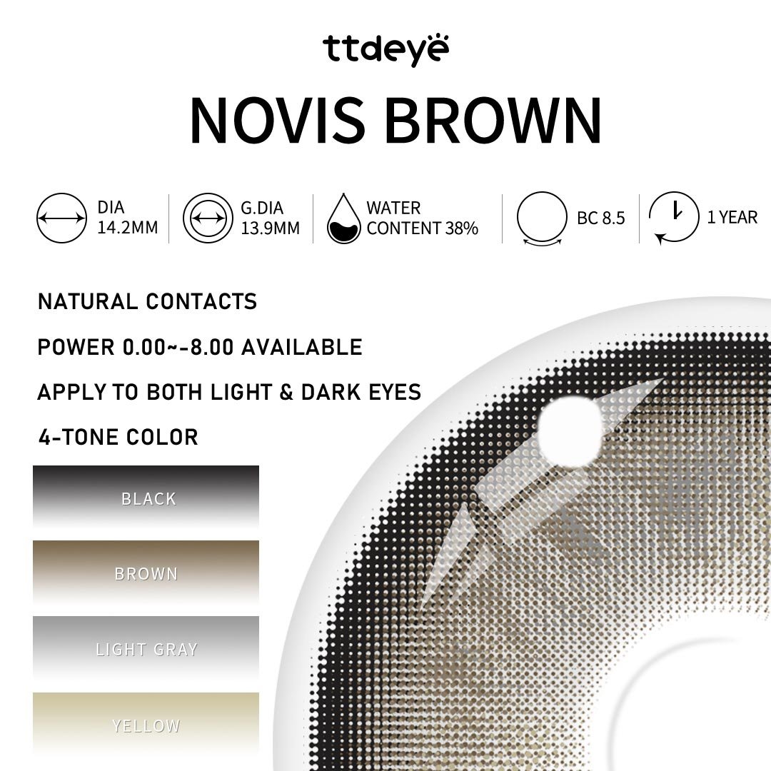 Las lentillas de color Novis Brown presentan un suave diseño degradado con una base gris claro y amarilla que se difumina gradualmente en un marrón cálido, con un sutil borde negro que aporta profundidad y dimensión. El centro más claro ilumina el iris, mientras que el delicado sombreado del borde proporciona a tus ojos un aspecto más limpio, suave y refinado. Con suaves matices grisáceos-marrones, el efecto general es elegante y discreto, como el sereno resplandor del crepúsculo nórdico.